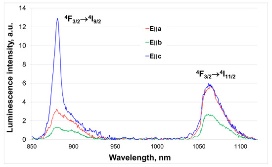 Two characteristic Nd3+ luminescence bands were observed in both of the above-specified ranges. They correspond to the 4F3/2→4I9/2 and 4F3/2→4I11/2 spectral transitions. An example of the polarized luminescence spectra of Nd:MgMoO4 crystals is presented in Figure 12. It consists of two bands corresponding to the 4F3/2→4I9/2 and 4F3/2→4I11/2 transitions of the Nd3+ ion. The intensity ratio of these two luminescence bands depends on the polarization. Stark structures of the bands are practically unresolved at 300 K, although non-Gaussian shapes of the bands are evident.