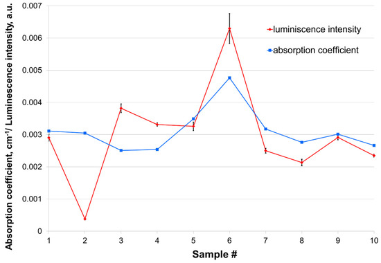 Figure 13 presents the relative intensities of the luminescence peak at 881 nm (E‖c polarization) for all the studied samples along with the optical absorption coefficients of the same samples at 745.6 nm. The arbitrary units of the luminescence intensities are scaled for the convenience of comparison with the absorption intensities.