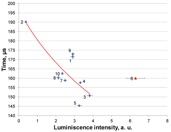 The decay kinetics are well approximated by the single-exponential law for all the studied crystals, indicating the presence of a single kind of luminescent center and the absence of any non-radiative excited energy transfer. The relationship between the decay times and the luminescence intensities of the samples is presented in Figure 15.