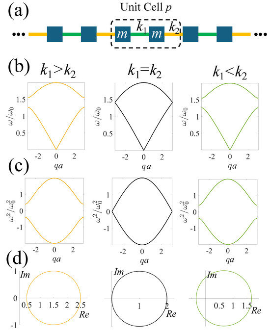 To simplify the illustration, we only consider displacements of identical masses, m, connected by alternating nearest-neighbor springs with spring constants and along the chain, as shown in Figure 1a. The governing equations of a lattice unit cell can be expressed as