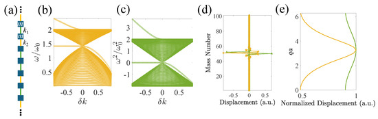 (a) An infinite lattice with a supercell containing 101 identical masses, m, with alternating springs possessing spring constants (green bars) and (yellow bars) forming an interface at the central mass, about which is connected on both sides. and . (b) Normalized eigenfrequencies of the finite lattice in (a). (c) Normalized eigenvalues of the stiffness matrix of (a) after subtracting . (d) Supercell eigenmodes when (green triangles) and (yellow circles). (e) Spatial Fourier transform of the mode shapes in (d).