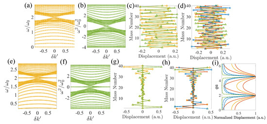 (a) Normalized eigenfrequencies of the finite lattice in Figure 5a with , , and . (b) Normalized eigenvalues of the stiffness matrix from the same setup as in (a) after subtracting . (c,d) Twentieth to twenty-third mode shapes (yellow circles, green triangles, blue squares, and red crosses, respectively) when (c) (only twentieth and twenty-first modes are shown) and (d) . (e) Normalized eigenfrequencies of the finite lattice in Figure 5e with , , and . (f) Normalized eigenvalues of the stiffness matrix from the same setup as (e) after subtracting . (g,h) Twentieth to twenty-third mode shapes (yellow circles, green triangles, blue squares, and red crosses, respectively) when (c) (only twentieth and twenty-first modes are shown) and (d) . (i) Spatial Fourier transform of the mode shapes shown in (c) (green dashed), (d) (blue dashed), (g) (yellow solid), and (h) (red solid) from the edge to the bulk.