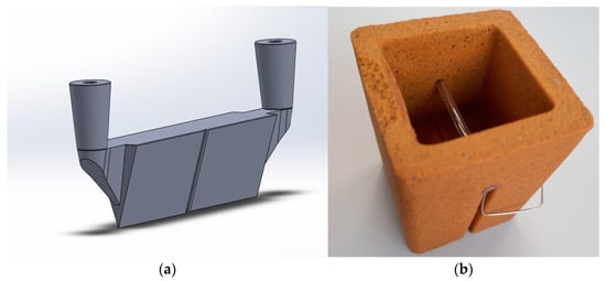 The wedge cavity was prepared with dry silica sand and by using a special 3D-printed core, as shown in Figure 1a. For TA analysis, in Figure 1b, a regular TA cup (Nova Cast, Ronneby, Sweden) was used equipped with a K-type thermocouple calibrated within ±1.2 °C at 1000 °C [26].