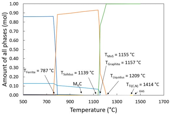 Based on Table 2, there is no expected precipitation of BN for given compositions (0–37 ppm B and 100 ppm N) and, therefore, boron is not expected to work as a potential inoculator based solely on the presumption of formed BN. The only nitride or carbo–nitride that are present before the primary and eutectic austenite and eutectic graphite start to precipitate from the liquid is Ti(C, N) or co-precipitated (Ti, V, Fe)1(N, C, Va)1. Based on these calculations, when nitrogen is sufficiently raised, BN seems to be thermodynamically stable, but the formation of BN is predicted to occur after graphite precipitation. Therefore, up to 150 ppm of raised nitrogen (N) the BN seems not to be present as a major active nucleator for graphite precipitation. However, the precipitation of BN is still predicted above the solidus temperature, which gives it the possibility of being a weak inoculator in the last solidification region. The BN is formed at 1125 °C at 37 ppm B at raised nitrogen, and is also potentially in the form of solute enrichment in the last liquid region. According to the calculations, when boron is included, it is integrated into the graphite phase from start at approx. 1157 °C, and boron content rises to approx. 1086 °C. This is the temperature where M3B2 starts to become stable. Manganese sulfides (MnS), as non-metallic inclusions, are also predicted and expected in the last solidification region. The potential complexes formed between iron–molybdenum based M3B2 and MnS are not excluded due to their thermodynamic co-existence, and this is also the case for Ti(C, N), which is formed in the early stage of solidification. Based on the predicted equilibrium solidification, carbides (M6C, MC is also interpretated as M(C, N) type, etc.) are not formed from the liquid phase; however, under actual non-equilibrium conditions, primary carbides can be found, as shown later in this study.