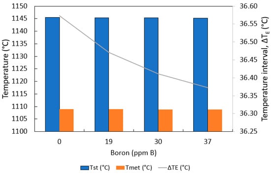 Based on the measured chemical composition, shown in Table 1, the activities of carbon in the liquid phase versus boron can also be calculated. The carbon activity predictions are carried out by first calculating the activity coefficient of carbon (). The calculation is made with the presumption of dilute solutions by first incorporating the Henryan activities (using 1 wt.% alternative reference state) in a multi-component liquid system to describe the thermodynamic behaviour of element (C) by first-order interaction parameters (coefficients) of carbon (, where i = C and solute j = Si, Mn, B etc.). The protocol and interaction values for this calculation are found elsewhere [34]. The carbon activity using the Raoultian reference scale, , in liquid is preferred and recalculated from the Henryan scale. The carbon activity values reveal practically no obvious activity changes with such a small boron content, toward the ability to graphite/carbide formation; and . The calculated values using the CALPHAD approach reveal similar values () concerning boron for carbon activity in liquid, and these values are similar to the values for stable pseudo-Fe-C system (ternary Fe-C-Si) for given carbon and silicon content [35,36,37]. However, by increasing the boron content, the carbon activity gradually increases. An increase in the activity of carbon in liquid reveals an improved ability for carbon to separate as graphite in the Fe-C system [38]. However, based on the diagram below, Figure 3, the temperature difference between stable and metastable eutectic intervals is barely noticeable for a given boron interval, but a higher boron content reveals a weak tendency toward mottled or white solidification if the content of boron is sufficient. This is possible when elemental enrichment appears in the last solidification front. In this study a low superheat was obtained to limit any elemental enrichement. However, in the case of added nitride forming Ti, as in our case, a graphitising influence can also be promoted among carbide promotion, as it is related to the nitrogen levels achieved in the melt [38]. This indicates a complex graphitisation behaviour for a given composition.