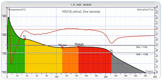 Based on the recorded (temperature–time) cooling curves, several parameters were extracted to evaluate basic information about the melt behaviour [39]. The basic parameters are TLiq, TELow, TEHigh, TES, TSol, Rec, UQ, ACEL, S1 and GRF2, and these are interpreted as liquidus temperature; the temperature of eutectic undercooling; the temperature of eutectic recalescence; eutectic start; solidus temperature (a solidified structure is represented with grey in Figure 5); recalescence (defined as TEHigh − TElow, the rise of temperature due to graphite precipitation); undercooling quotient; active carbon equivalent (calculated from TLiq); relative amount of primary austenite precipitation (yellow region in Figure 5); and first derivate of the cooling curve at solidification finish (graphite factor number 2), respectively. GRF2 is also a measure for inverted heat conductivity in a solid, being important for the purposes of graphite quantity and shape [40]. In this paper, the sign Rec is used for recalescence and the small letter r for the Pearson correlation coefficient, to avoid confusion.