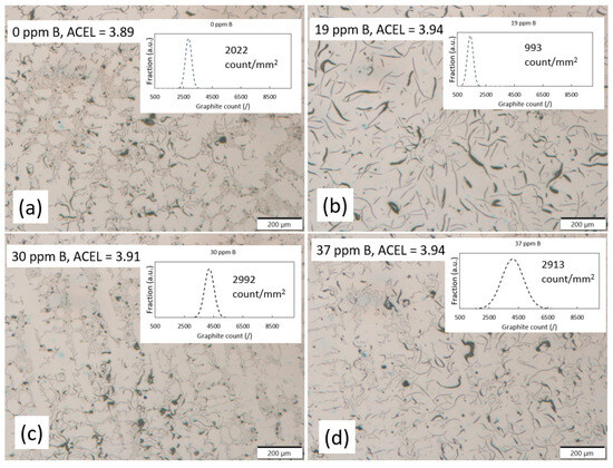 An example of the as-cast structure of TA samples and related graphite count distribution (a) 0 ppm B with finer size D/E graphite as reference (1 sigma, min–max = 2630–3058); (b) 19 ppm B with D/E graphite with thicker graphite flakes inside the eutectic cells of A as the majority (1 sigma, min–max = 1186–1606); (c) 30 ppm B with D/E with finer and local coarse size inside the eutectic cells (1 sigma, min–max = 3884–4531); (d) 37 ppm B with D/E with thicker eutectic flakes of A as the majority (1 sigma, min–max = 2995–5197). Calculated ACEL [41] from the obtained TLiq is between 3.89 and 3.94. Enlargement: 50×. State: Polished.