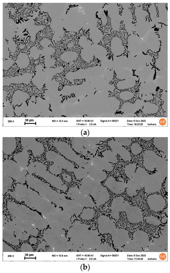 Thermal conductivity is an important physical property for elevated temperature use. The increased fractions of transformed austenitic primary crystals and branched D-type graphite lower the ability to transfer heat and are related to achieved cooling rates, inoculation efficiency, etc., meaning that it is not simply related to basic nominal composition [40]. A higher content of A-type is usually desired where high thermal conductivity and low friction losses are needed [23]. Thermal conductivity was not directly measured at room temperature. However, it is estimated by using the indirect method by observing the end of the solidification curve during TA, which can indicate the graphite shape. In this case, the angle of the derivate marked as GRF2 was used, as shown in Table 4. According to Stefanescu et al. [39], low angles can correspond to increased thermal conductivity. Compared to the analysed boron content and GRF2, no linear trend with thermal conductivity was observed (r = −0.23, R2 = 0.05). The lowest angles (highest conductivity) were determined with the sample with the highest ACEL, regardless of the boron content (19 and 37 ppm B). This complements the improved graphite distribution uniformity observed in Figure 6. In the case of the sample with the lowest ACEL, the undercooled dendritic graphite indicates lower heat transfer ability, even if graphite count is increased (compared to 0 and 30 ppm B with GRF2 and graphite count). Carbides have an influence on the conductivity, but the fractions are comparable with the TA samples, as shown under FE-SEM investigation later.