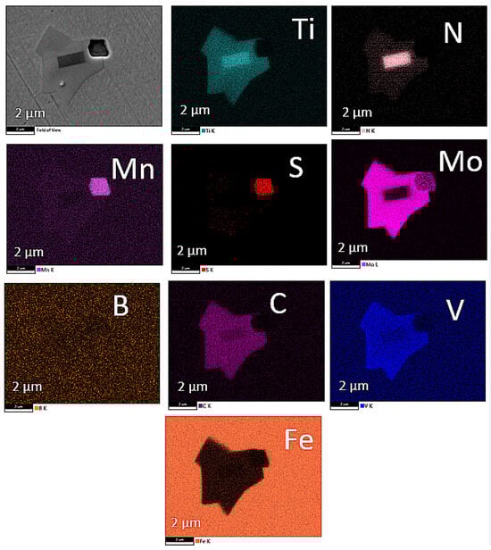 An example of the location of the last solidification region is shown in Figure 8, where complex interactions with carbonitrides and non-metallic inclusions (MnS) are observed. Both complex carbonitrides and MnS are predicted by Thermo-Calc. The boron was not observed. Additionally, the pearlite (not shown here) did not reveal the presence of any boron.