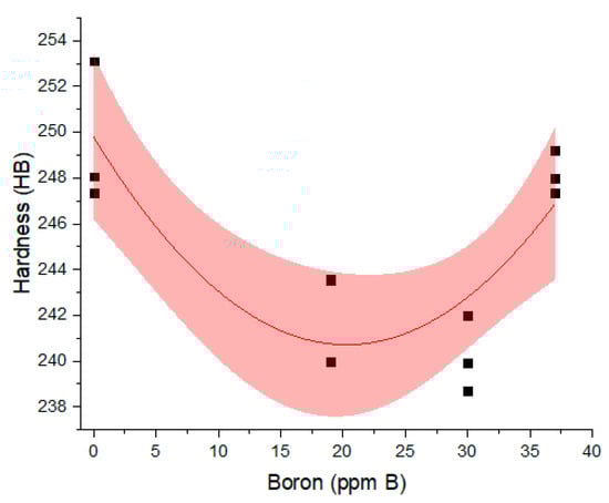 The hardness of TA extracted samples to evaluate the changes with the addition of boron with a 95% confidence band (red interval). The hardness is valid for 1 °C/s of solidification rate. No additional heat treatment (ferritisation) was performed.