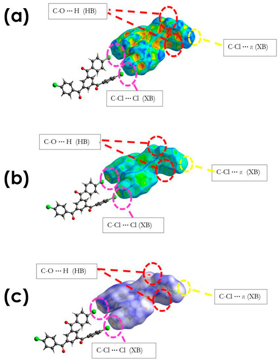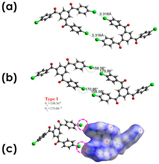 Crystal Explorer 17.5 [71,72,73,74] was used to compute 3D deformation density (DD) maps using the B3LYP/6-31G(d,p) wave function. The multipole modeling of X-ray data indicated the closed-shell nature of the interactions, where Cl···Cl Type I interactions might result as reduced repulsion by polar flattening effects as shown in Figure 10. A similar characteristic was reported for the Cl···Cl interaction by Row et al. [87].