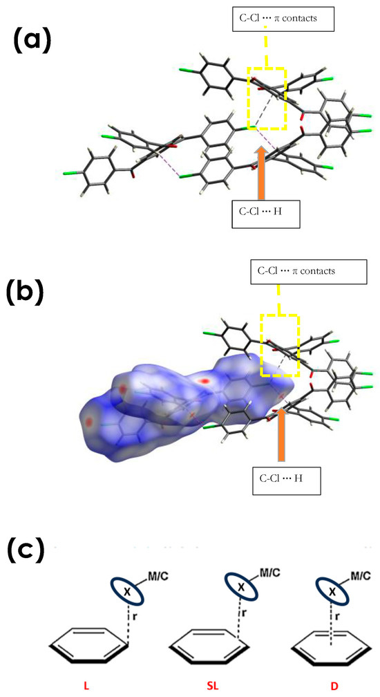 Halogen···π contacts are another common weak interaction that is frequently ignored due to the presence of other interactions [60]. Shishkin and Schneider [60,84] summarized this based on the location of the halogen atom relative to the aromatic plane: delocalized (D), semilocalized (SL) and localized (L), as shown in Figure 4c [60,84]. Compound A shows a localized halogen···π interaction (Type III halogen bonding) as shown in Figure 4a,b. Additionally, the same chlorine atom is involved in HB with another neighbouring molecule with a distant (C-Cl···H) HB interaction, [C--Cl···H= 162.26°, C-Cl···Cl= 127.60°, C-Cl···Cl =2.83 Å]. It should be noted that an HB interaction is observed with the chlorine atom, which is simultaneously participating in XB···π interactions. The HB interactions were observed to be perpendicular to the XB interactions, a phenomenon which might be proposed to arise from the distribution of electrostatic potential on the chlorine atom. It should be stated that the C-O···H distance in all interactions are shorter than the sum of the mean van der Waals radii of the two atoms 2.72 Å.