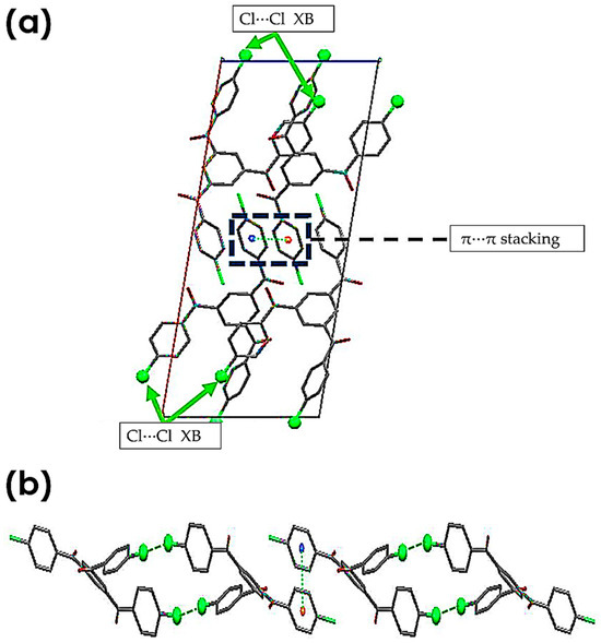 (a) Unit cell of 3 viewed along the b-axis highlighted the presence of Cl···Cl halogen bonding dimer (identified using green arrows), and the presence of π···π stacking is highlighted in dark blue. (b) 1D chain formed by Cl···Cl XB dimer and the presence of π···π stacking for compound 3. H atoms are not show for clarity. Atom colors: carbon atoms = grey, oxygen atoms = red, chlorine atoms = green.