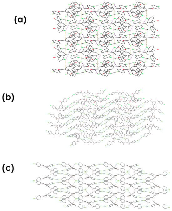 Crystal-packing diagram of 3 viewed along the (a) a-axis, (b) b-axis, and (c) c-axis. H atoms are not show for clarity. Intermolecular interaction presence is C-Cl···Cl, C-C···H, C-Cl···π, and other interaction. Atom colors: carbon atoms = grey, oxygen atoms = red, chlorine atoms = green.