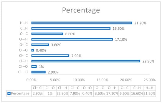Intermolecular contacts of compound 3 were plotted using 2D FP (Figure S7 and Figure 7) to provide additional evidence for the presence of XB interactions in compound 3 by calculating the percentage contribution of all interactions in the crystal structures. From a simple analysis, it immediately emerges that the Cl···H contacts have the highest contribution in comparison to all other interactions in the crystal structures. H···H and C···H interactions are responsible for the second and third contributions, respectively. Cl···C interactions show 7.9%, and Cl···Cl shows 2.9%. The final observation is the presence of ‘wings’, which are a typical representation of C-H···π contacts in the fingerprint plot: 16.6%.