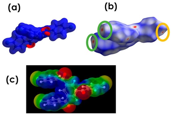 In Figure 8b, halogen bonding visualized using the electrostatic potential (ESP) is mapped onto Hirshfeld surfaces [71,86] by using wave functions that were obtained at the HF/STO-3G level [86]. These XB interactions are also reflected in the Hirshfeld surface mapped over the electrostatic potential displayed in Figure 8, where a blue region indicates a positive electrostatic potential and a red region indicates a negative electrostatic potential. It is clear that two red regions are observed around the two chlorine atoms, which formed double halogen bonding with two chlorine atoms in the neighboring molecule, forming a dimeric structure. The red spots are hightides in the green cycle. Additionally, faint red regions also appeared around the third chlorine atom corresponding to C-Cl···H, which is highlighted in yellow. Additionally, electrostatic potential (PE) mapped on Hirshfeld surface of the molecule is presented in Figure 9.