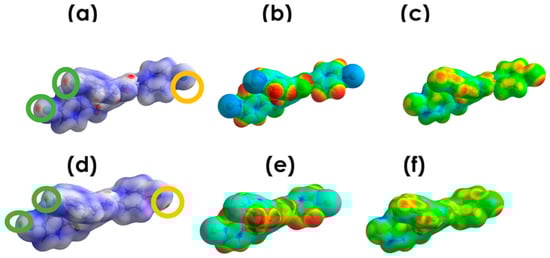 The title molecule’s shape-index surfaces were constructed in the ranges −1 to 1 Å as shown in Figure 2a. Typically, the convex blue areas represent hydrogen or halogen donor groups, while the concave red areas represent hydrogen or halogen acceptor groups. On the shape-index map, π···π interactions are represented by adjacent red and blue triangles. There is evidence of the existence of π···π interactions between nearby molecules in the title complex, as shown in Figure 2a–c. Moreover, the title molecule’s A curvedness surfaces were constructed in the ranges −4 to 0.4 Å as shown in Figure 2b. Usually, the flat surface area appeared in green regions, while the curvature area appeared as blue regions. Flat regions around the rings could be evidence of a π–π stacking interaction.