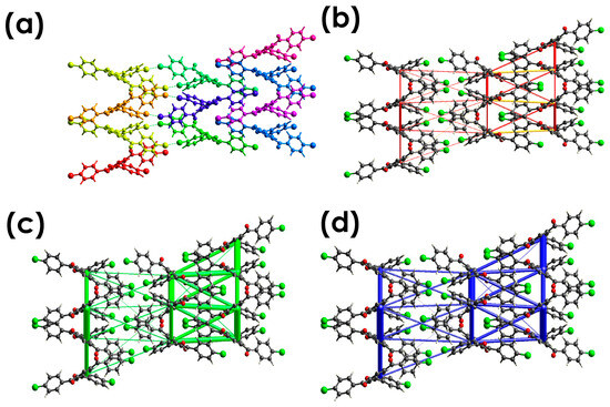(a) Illustration of molecular interactions in a cluster with a radius of 3.8 Å between the centrally investigated molecule and neighboring molecules viewed down the c-axis. (b) Cylindrical tube formation of columbic energy as red tubes, (c) dispersion force as green tubes, and (d) total energy as blue tubes. Carbon atoms = grey, oxygen atoms = red, chlorine atoms = green.