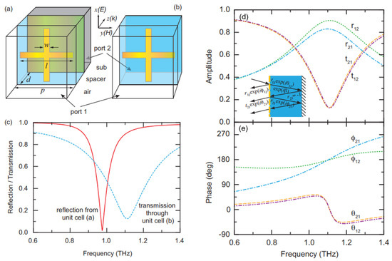 (a) Schematic of the unit cell for a metamaterial absorber, which is repeated in the x and y directions, forming a square array with a periodicity p. (b) Unit cell used to obtain the reflection and transmission coefficients at the air–spacer interface with a cross-resonator array. (c) Solid red curve is the reflection |S11| from unit cell (a) of the metamaterial absorber, and the dashed blue curve is the resonant transmission |S21| through the cross resonator array shown in unit cell (b). (d) Amplitude and (e) phase of the reflection and transmission coefficients at the air–spacer interface with the cross-resonator array, obtained by the numerical simulation based on the unit cell shown in (b). Inset: Multiple reflections and the interference model of the metamaterial absorber, where the cross-resonator array is indicated by the dashed line at the air–spacer interface [44].