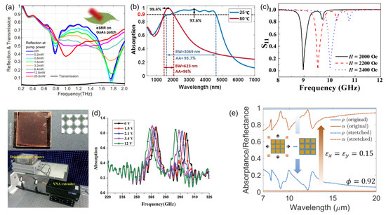 The development of tunable metamaterial absorbers needs the consideration of desired frequency range, tuning mechanism, and overall performance specifications. The successful realization of these absorbers has required the integration of various tuning mechanisms, such as optical [47] (Figure 3a), temperature [48] (Figure 3b), magnetical [49] (Figure 3c), electrical [50] (Figure 3d), and mechanical tuning mechanisms [51] (Figure 3e), in the metamaterial structure to achieve the desired level of tunability, as shown in Figure 3. The selection of a suitable tuning mechanism depends on several factors, such as the desired frequency range, required level of tunability, and practical constraints associated with the specific application. For instance, the optical tuning mechanism might be preferred for applications that require high-speed modulation and low-power consumption [47]. On the other hand, temperature and electrical tunings are more appropriate for applications which need precise and stable tuning over an extended period [48,50]. Similarly, the magnetical and mechanical tuning mechanisms also have their own special application purposes [49,51]. The integration of different tuning mechanisms within the metamaterial structure should be accompanied by the careful consideration of the design and fabrication process. This includes the selection of appropriate materials, the optimization of structural parameters, and the implementation of suitable fabrication techniques. The successful implementation of these processes is crucial to achieve the desired level of tunability and overall performance of the metamaterial absorber.