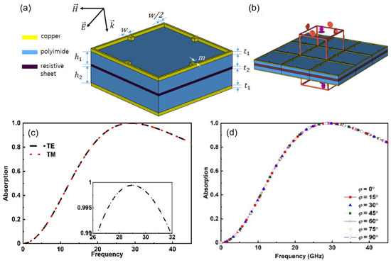 A polarization-insensitive metamaterial absorber with high absorption performance was proposed by Zheng et al. [68]. The structure consists of five layers arranged in the following order: the top layer is a copper pattern layer, followed by an upper polyimide layer, a resistive sheet, a lower polyimide layer, and finally, a continuous copper layer at the bottom. This configuration is illustrated in Figure 5a. The copper used in the structure had a conductivity of 5.8 × 108 S/m, while the resistive sheet had a resistance of 540 Ω/sq. The polyimide layers had a dielectric constant of 3.5 and a loss tangent of 0.0027. The periodicity of the structure was 4.4 mm. To investigate the metamaterial structure, the periodic boundary conditions were applied on the x-y plane, as depicted in Figure 5b. Figure 5c displays the outcomes of the study, demonstrating the near-perfect absorption (99.8%) of the metamaterial structure across a wavelength range from 26.35 to 31.9 GHz for both TE and TM-polarized waves at the normal incidence. Furthermore, due to their inherent symmetry, the metamaterial structures exhibited an insensitivity to polarization angle, as illustrated in Figure 5d.