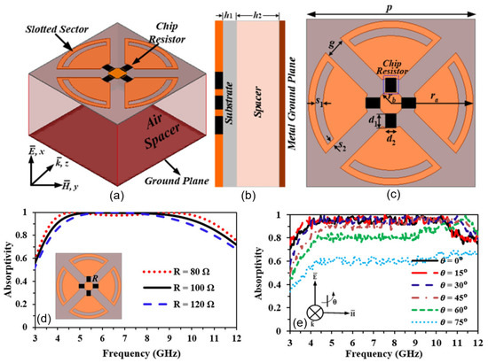 The unit-cell design of this kind of broadband metamaterial absorber is depicted in Figure 6a–c from different perspectives: perspective, side, and top views. The unit cell was in a circular shape with slots and equipped with resistors [73]. Kalraiya et al. [73] achieved a broad range of higher than 90% of absorption between 5 and 10.5 GHz by adjusting the resistor values, as illustrated in Figure 6d. Additionally, the high symmetry of the circular unit cell rendered the metamaterial absorber to have a wide range of incident angles, as demonstrated in Figure 6e. The broadband of the metamaterial absorber can be maintained to be above 90% at an incident angle up to 30 degrees, and to be above 80% even at an incident angle of 45 degrees or higher.