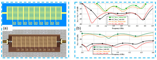 Antenna Design: Broadband metamaterial absorbers are utilized in antenna design to enhance performance. They can be used to suppress unwanted reflections, reduce the side lobes, and improve the overall efficiency and bandwidth [74]. By incorporating the metamaterial absorbers, researchers could achieve improved antenna characteristics and optimize the antenna performance for specific applications. Figure 7a shows a proposed metamaterial antenna structure in the simulation layout and photo of the prototype [75]. The antenna employed a configuration of ten metamaterial unit cells, each of which consisted of a pair of series interdigital capacitors and a short-circuited inductive stub by using a metallic interconnection. A lossy substrate FR-4 with a thickness of 0.8 mm, loss-tangent of 0.025 was used to implement a prototype of the proposed planar antenna. The effect of a metamaterial antenna with a substrate-integrated waveguide (SIWs) is demonstrated in Figure 7b by the simulated and measured reflection coefficient (S11) and transmission one (S21). S11 quantifies the impedance matching, and S21 presents the isolation between the two ports. The results illustrate that the reflection and transmission coefficients in the cases with SIWs are much better than those without SIWs. This demonstrates that the reflection and transmission coefficients are significantly improved by employing the SIWs.