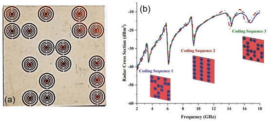 Radar Cross-section Reduction: Broadband metamaterial absorbers play a crucial role in stealth technology by reducing the radar cross-section (RCS) of objects or structures. By absorbing and selectively dissipating incident electromagnetic waves, the metamaterial absorbers can effectively minimize the radar signature of objects, making them less detectable by radar systems [76]. This application has significant implications for military and defense research. A coding metasurface is a cutting-edge technology which manipulates electromagnetic waves, based on the cleverly-designed properties of the unit cell called meta-atoms. These meta-atoms were engineered to control the phase, amplitude, and polarization of reflected waves. A broadband coding metamaterial was designed for the RCS reduction, as presented in Figure 8a [77]. The RCS was manipulated by the different metamaterial coding sequences, as shown in Figure 8b.
