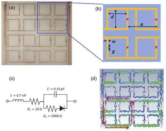 Design of a rectenna-based metamaterial. (a) SRR array with diodes embedded in the gaps, (b) sketch model of the unit cell, (c) equivalent circuit model of the Schottky diode, and (d) surface-current distribution at the resonance frequency [81].
