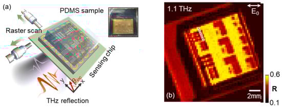 (a) Experimental process for THz-reflection measurement with a motorized raster-scanning stage, and (b) reflectance images at 1.1 THz by using the metamaterial [85].