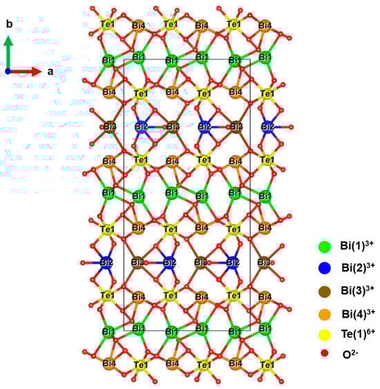 Compared to the structure of Bi6Te2O15 obtained from the crystal fragment of natural pingguite [14], the structure of Bi6Te2O15 synthesized using the conventional solid-state method described above was similar, except that the bond distance information of the synthesized structure was better. Thus, only a brief description of the structure of Bi6Te2O15 is given here. In the binary system, Bi6Te2O15 exhibited a three-dimensional network consisting of one unique Te6+ and four unique Bi3+ cations (see Figure 1). The Te6+ cation showed an octahedral structure with six O2− anions, and the bond distances of Te–O ranged from 1.912 to 1.958 Å. Although the Te4+ cation from TeO2 was used as a starting reagent, it was expected that the relatively higher temperature condition would induce the oxidation of Te4+ cations to Te6+, accompanied by a structural change from trigonal pyramidal to octahedral. It was also proved that Te has an approx. 6+ oxidation (5.80) from the bond valance sum (BVS) calculation [31,32,33] (see Table 3). Each Bi3+ cation had a five-coordinated square pyramidal structure with asymmetric environments, and the bond distances of Bi–O ranged from 2.098 to 2.585 Å.