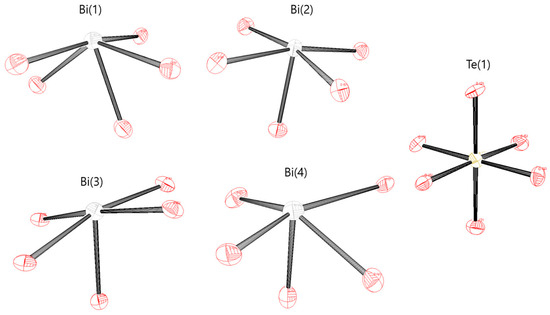 ORTEP representations (50% probability ellipsoids) of Bi(1)3+, Bi(2)3+, Bi(3)3+, Bi(4)3+, and Te(1)6+ cations.