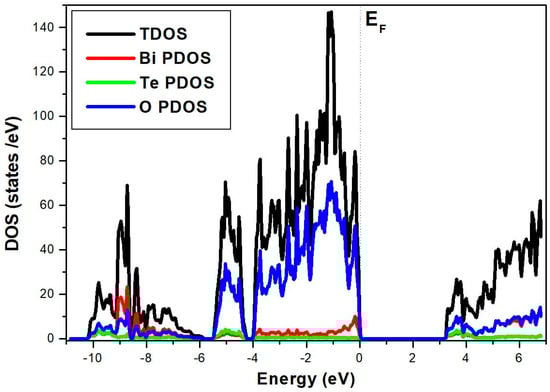 The band structure of Bi6Te2O15 was calculated with the volume-optimized structures along highly symmetrical points of the first Brillouin zone, Γ-Χ-S-Y-Γ-Z-U-R-T-Z, using different exchange-correlation potentials [48,49] (see Figure 3 and Table 5). To get the band-gap energy to match with the experimental one, the modified potential (TB-mBJ) was also used [29,50,51]. However, the calculated band gap was slightly higher than the experimental result by 0.07 eV (see Table 5). To further explain the nature of the electronic structure, the total density of state (TDOS) and partial density of state (PDOS) were also calculated with the GGA-PBE and the TB-mBJ potential. Figure 4 shows the plots of the TDOS and PDOS of Bi6Te2O15 with the Fermi level (EF), as illustrated by the vertical dot line at 0 eV. The lowest part of the valence band region (from −10.3 to −5.5 eV) was formed mainly by Bi-, Te-, and O-PDOS and attributed to the electrons occupying the Bi-6s, Te-5s, and O-2s orbitals, while the middle part (from −5.5 to −4.2 eV) was created by the electrons occupying the Bi-6p, Te-6p, and O-2p orbitals. In addition, the O-PDOS caused by the electrons occupying the O-2p orbitals was perceived as the main contributor to the highest part of the valence band region (from −4.2 to 0 eV). The conduction band (from 3.3 to 6.8 eV) was attributed to the empty electron orbitals of Bi-6p, Te-5p, and O-2p.