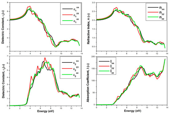 Both the real and imaginary parts of the dielectric function allow the calculation of other optical functions such as refractive index n (ω), optical absorption coefficient I(ω), reflectivity R(ω), the real part of optical conductivity σ(ω), and the energy-loss function L(ω) [55,57]. As depicted in Figure 5, the static refraction index n(0) of Bi6Te2O15 is ~2.1 for three components. The maximum peaks of nxx(ω), nyy(ω), and nzz(ω) are 2.5, 2.7, and 2.6, respectively, near 4 eV of photon energy. Given that n(ω) ⟩ 1 for a given type of matter, the speed of the photons is reduced when they enter the matter because the photons interact with electrons. Thus, the higher electronic density of a material also increases its n(ω). The calculated absorption coefficient I(ω) is also shown in Figure 5. The threshold point at which matter begins to absorb electromagnetic radiation is 3.16, 3.30, and 3.22 eV, according to the three polarization directions for the structure of Bi6Te2O15. The maximum absorptions for Ixx, Iyy, and Izz are also diverse at different photon energies. Other optical properties, such as reflectivity R(ω), the real part of optical conductivity σ(ω), and the energy-loss function L(ω) described above, are summarized in Table 6, and their spectra are also depicted in the Supporting Information (see Figure S6).