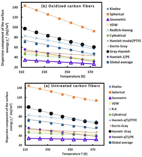 All previous various molecular models and the Dorris–Gray method were used to determine the dispersive component of the surface energy of the carbon fibers (untreated and oxidized). The results were compared to those obtained using the thermal model [,,] (Figure 1). The variations in of the carbon fibers as a function of the temperature satisfied excellent linear variations. Figure 1 shows large deviations between the values of calculated using the different models, which can reach 300% in the case of the spherical model. The application of the Dorris–Gray relation gave large values of in the case of the thermal model. The most accurate results were obtained using the thermal model [,,]. One observed that the results of the thermal model (by using the results on PE) were very close to those of the cylindrical, Kiselev, Dorris–Gray and VDW models, whereas the average values gave similar results to those of the thermal model (on PTFE). Furthermore, a comparison between the dispersive surface energy of the carbon fiber types showed small differences not exceeding 10% in all used molecular models. One found a weaker decrease in in the case of the oxidized carbon fiber.