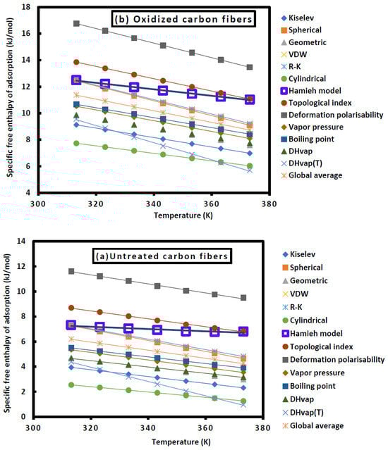 The variations in allowed one to obtain the values of specific enthalpy ( and entropy ( of the adsorption of the polar molecules on carbon fibers (a) and (b) for the various models and chromatographic methods. The obtained values of ( are shown in Table 2 and those of ( are shown in Table S8. The determined values of the specific variables varied from one molecular model to the other, with a large deviation. One can conclude that the thermal model gave more accurate results because it took into consideration the thermal effect on the surface area of the organic molecules; this was neglected in the other molecular models (Table 2 and Table S8).