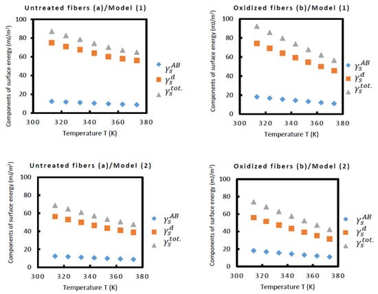 The application of relation (8) allowed for the determination of the values of of the carbon fibers at different temperatures. Table 7 shows the different values of , and of the untreated and oxidized carbon fibers, and (in mJ/m2) of untreated and oxidized carbon fibers.