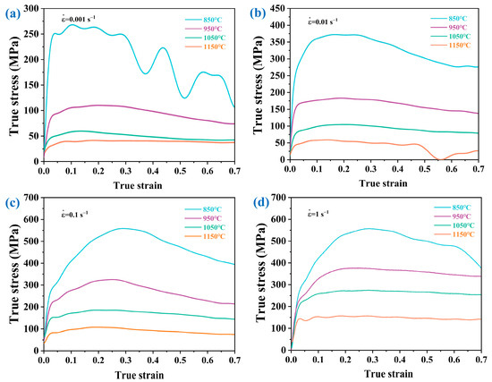 True stress-strain curves of the CoCr0.4NiSi0.3 alloy at different deformation conditions. (a) 0.001 s−1; (b) 0.01 s−1; (c) 0.1 s−1; (d) 1 s−1.