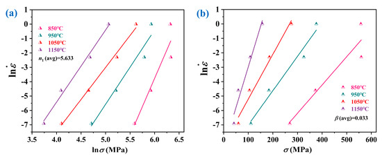 If the relationship of ln − lnσ and ln − σ described in Equations (5) and (6) are linear, the slopes are n1 and β, respectively. Table 1 presents the σp at various strain rates and temperatures. Figure 3a,b illustrate the fitting lines of ln − lnσp and ln − σp from which n1 and β are determined as 5.633 and 0.033, respectively. Therefore, the value of α, calculated as α = β/n1, is determined to be 0.0059 MPa−1.