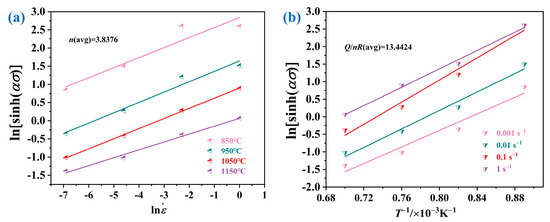 According to Equation (4), if there is a linear relationship between ln[sinh(ασ)] and ln, then the slope is n−1, consequently, the stress indices of n can be determined. Similarly, if there is a linear relationship between ln[sinh(ασ)] and T−1, then the slope value represents Q/nR and the activation energy Q can be expressed as: