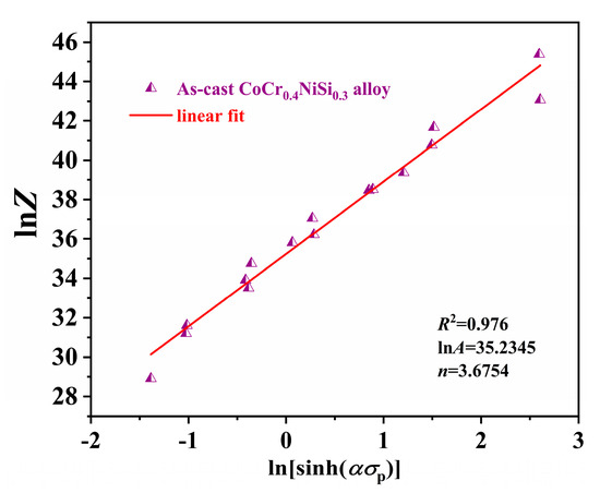 If the relationship between lnZ and ln[sinh(ασ)] described in Equation (11) exhibits linearity, the slope corresponds to n, while the intercept corresponds to lnA. The Z values were derived by substituting the σp obtained under various deformation conditions into Equation (11). Through the utilization of linear regression analysis, as illustrated in Figure 5, the value of lnA was determined to be 35.2345. This resulted in an A value of 2.0052 × 1015 MPa−1, and n was determined to be 3.6754, which closely matches the fitting result shown in Figure 4a. The range of ασp values in this study spans from 0.25 to 3.30. To characterize the model for this MEA at a true strain of 0.76, we employ the Arrhenius-type hyperbolic sine formula described in Equation (2), which is presented as Equation (12):