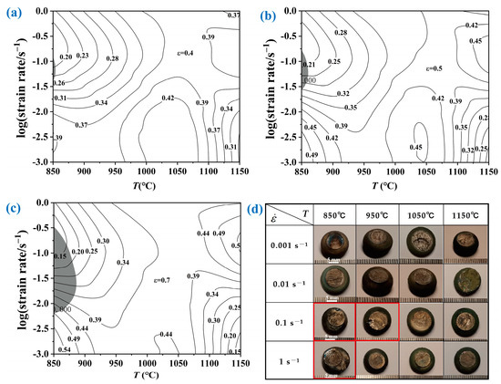 Hot processing maps of the CoCr0.4NiSi0.3 alloy at (a) ε = 0.4; (b) ε = 0.5; (c) ε = 0.7; (d) Macroscopic morphologies of hot deformed CoCr0.4NiSi0.3 alloy at different processing parameters.