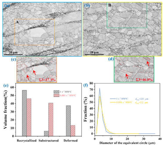 Band contrast image at deformation conditions of (a) 1 s−1/850 °C and (b) 0.001 s−1/850 °C; Band contrast images overlaid with Σ3 grain boundaries corresponding to (c) area A in Figure 7a, and (d) area B in Figure 7b; (e) Contrast between volume fraction of recrystallized, substructured, and deformed grains at deformation conditions of 1 s−1/850 °C, and 0.001 s−1/850 °C; (f) Average grain diameter at deformation conditions of 1 s−1/850 °C, and 0.001 s−1/850 °C.