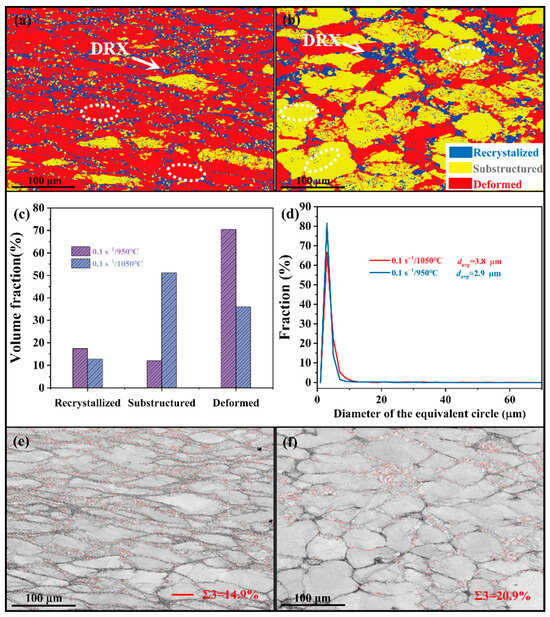 (a) The distribution of recrystallized, substructured, and deformed grains at deformation conditions of 0.1 s−1/950 °C and (b) 0.1 s−1/1050 °C; (c) Contrast between volume fraction of recrystallized, substructured, and deformed grains at deformation conditions of 0.1 s−1/950 °C and 0.1 s−1/1050 °C; (d) Average grain diameter at deformation conditions of 0.1 s−1/950 °C and 0.1 s−1/1050 °C; Band contrast images overlaid with Σ3 grain boundaries corresponding to the area of (e) Figure 8a and (f) Figure 8b.