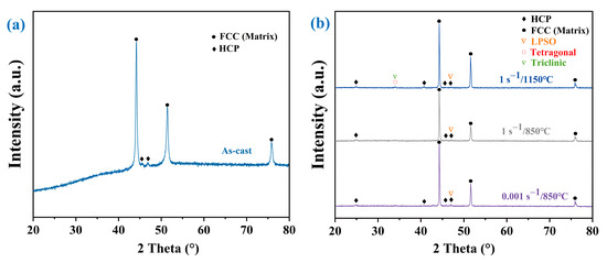 (a) XRD pattern of the as-cast CoCr0.4NiSi0.3 alloy; (b) XRD patterns of the CoCr0.4NiSi0.3 alloy hot compressed at 0.001 s−1/850 °C, 1 s−1/850 °C, and 1 s−1/1150 °C.