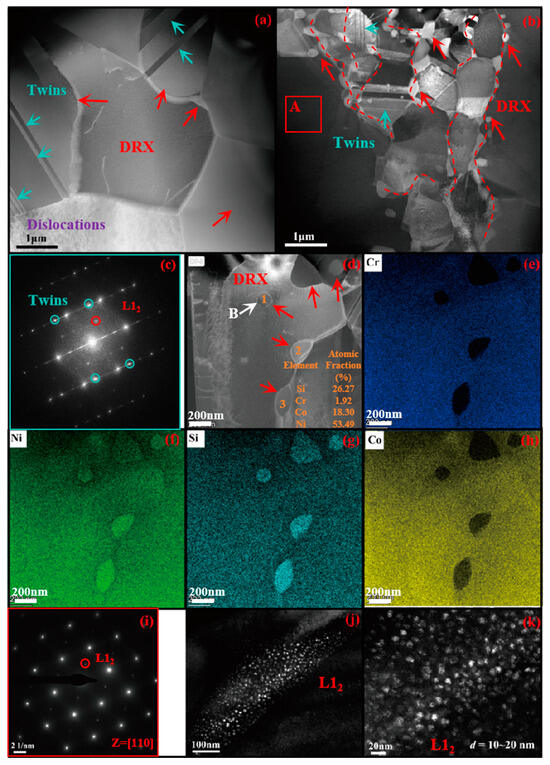 The XRD pattern of the as-cast CoCr0.4NiSi0.3 alloy is depicted in Figure 10a. The XRD patterns of the axial cross-section of the specimens after hot compression under deformation conditions of 0.001 s−1/850 °C, 1 s−1/850 °C, and 1 s−1/1150 °C are presented in Figure 10b. It is evident that the diffraction intensity of the second phase decreases with increasing strain rates and deformation temperatures after hot compression. Moreover, under a hot compression condition of 1 s−1/1150 °C, there is an emergence of additional second phases and an enhancement in the intensity of the HCP structure at 2θ angle of 40.84°. The high-angle annular dark-field scanning transmission electron microscopy (HAADF STEM) images in Figure 11a,b demonstrate the morphological characteristics near grain boundaries under a hot deformation condition of 1 s−1/850 °C. The recrystallized fine grains are primarily distributed along the grain boundaries, with limited occurrence within the grains. The presence of twins and the L12 phase under this deformation condition was confirmed by the analysis of selected area electron diffraction (SAED), as depicted in Figure 11c. The energy dispersive spectrum (EDS), shown in Figure 11e–h, corresponds to the dark field image region displayed in Figure 11d, where B represents the intragranular DRXed grain. The EDS analysis revealed that the average chemical composition of the DRXed grains, denoted as 1, 2, and 3, was determined to be 18.30 Co–1.92 Cr–53.49 Ni–26.27 Si (at.%). The SAED analysis was conducted on region A of the matrix depicted in Figure 11b, as illustrated in Figure 11i. The crystallographic plane indicated by the red circle has been confirmed to be in the L12 phase, and the fast Fourier transformed (FFT) image of the L12 phase is presented in Figure 11j.
