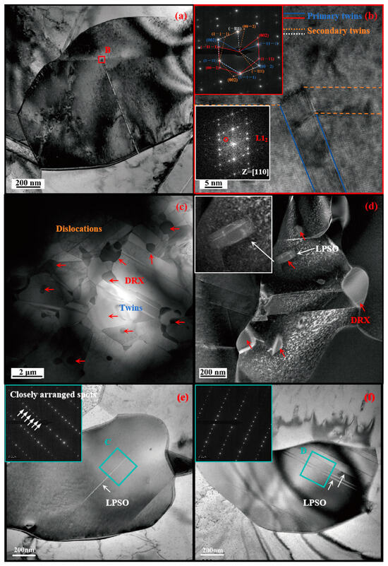 (a) Dark field images of double twins morphology under hot deformation condition of 0.001 s−1/850 °C; (b) High-resolution image of region B in Figure 12a; The microstructural morphologies near grain boundaries at (c) 0.001 s−1/850 °C, and (d) 1 s−1/850 °C; (e,f) The microstructural morphologies of DRX at 0.001 s−1/850 °C exhibit the LPSO structure.