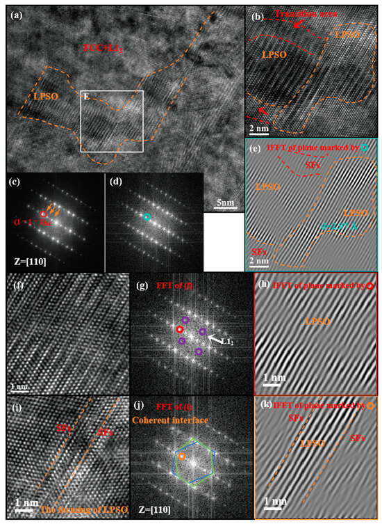 (a) The high-resolution image of LPSO structure under deformation condition of 0.001 s−1/850 °C; (b) The enlarged region E of Figure 13a; (c) The FFT of Figure 13a; (d) The FFT of Figure 13b; (e) The IFFT of crystallographic plane circled in green in Figure 13d; (f) The “good region” of LPSO structure from Figure 13b; (g) The FFT of Figure 13f demonstrates the presence of the L12 phase; (h) The IFFT of crystallographic plane circled in red in Figure 13g; (i) The “transition region” of the LPSO structure from Figure 13b; (j) The FFT of Figure 13i demonstrates the coherent relationship between the matrix, twins, and LPSO phase; (k) The IFFT of crystallographic plane circled in yellow in Figure 13j.