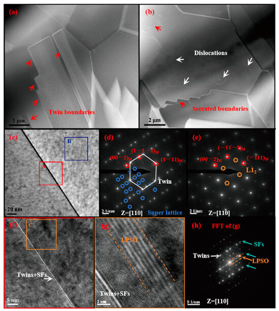 Figure 14a depicts the morphology of twins in recrystallized grains at 1 s−1/1150 °C, while Figure 14b demonstrates the presence of dislocations and serrated grain boundaries within the recrystallized grain, indicating the experience of elevated local flow stress. The EDS analysis was conducted at a deformation condition of 1 s−1/1150 °C, revealing the chemical composition of the DRXed phase was 20.14 Co–2.51 Cr–54.08 Ni–23.28 Si (at.%). The volume fractions of recrystallized and substructured grains in Figure 9c are confirmed as 66.89% and 21.30%, respectively, while the volume fraction of Σ3 grain boundary in Figure 9f is determined to be 46.5%. Elevated strain rates and deformation temperatures result in elevated volume fractions of DRX and dislocations. As the DRXed grains continue to grow, they actively contribute to deformation by generating dislocations and promoting deformation twinning. The diffraction pattern observed in Figure 14d corresponds to region A as depicted in Figure 14c, demonstrating the presence of twins. Similarly, the diffraction pattern shown in Figure 14e corresponds to region B in Figure 14c. In addition to the FCC matrix, it can be inferred from Figure 14e that the L12 phase is coherent with the matrix. Moreover, a high-resolution image of region A from Figure 14c is presented in Figure 14f, while an enlarged high-resolution image of region C is displayed in Figure 14g. Finally, the FFT analysis of the region depicted in Figure 14g is illustrated in Figure 14h. Based on Figure 14d,f–h, it can be concluded that apart from twins, SFs, and LPSO structures that are coherent within the FCC matrix, there exist coherent superlattice structures within region A. These superlattice structures form at a temperature resistance level of 1 s−1/1150 °C. The thickness of the LPSO lamellae decreases with increasing temperature, ranging from 16 nm at 850 °C (Figure 13a) to 4–8 nm at 1150 °C (Figure 14g). The occurrence and transformation of the LPSO phase indicate its metastable nature, which is influenced by both temperature and stress and is accompanied by twinning and SFs.