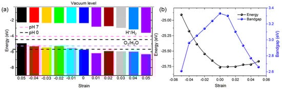 The band edge positions of the SiC/GaN van der Waals heterostructure are calculated with different external biaxial strains, as shown in Figure 5a. One can see that the SiC/GaN van der Waals heterostructure possesses decent band alignment to induce the redox (−5.67 eV for oxidation and −4.44 eV for reduction) water splitting at pH 0 under 0–0.05 strain. At the same time, the potential for reduction and oxidation also can be determined by the pH level using Ered = −4.44 eV + pH × 0.059 eV and Eoxd = −5.67 eV + pH × 0.059 eV, respectively []. Thus, the SiC/GaN van der Waals heterostructure under −0.04 to 0.05 strain also can promote water oxidation (−5.26 eV) and reduction (−4.03 eV) at pH = 7 for water splitting. The total energy of the system and the bandgap of the stained SiC/GaN van der Waals heterostructure are shown in Figure 5b. The SiC/GaN system without any external strain shows the lowest energy. Interestingly, the bandgap of the SiC/GaN van der Waals heterostructure can decrease with both tension and pressure.